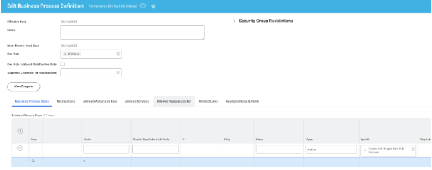 Next, configure an allowable sub-process on termination that automatically creates a job requisition against the existing position when someone terminates. This kicks off recruiting immediately while maintaining the position for workforce planning purposes.